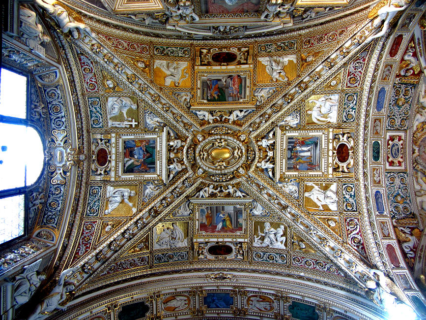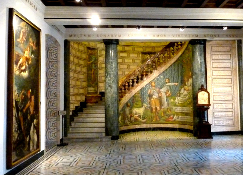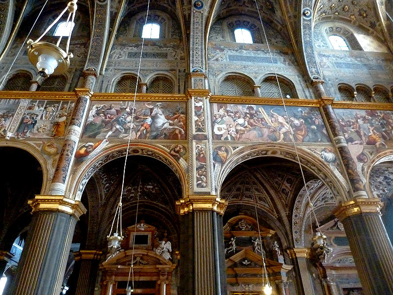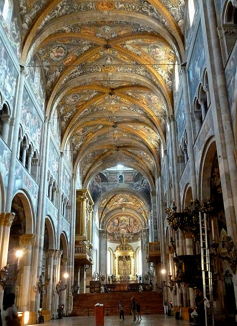 Spazieren durch den Palazzo Pelote - dessen Innenhof mit Tribünen und einer Bühne komplett ausgefüllt ist - ins Zentrum. Die Touristen-Info ist übersiedelt und montags erst nachmittags offen, also spazieren wir durch die Fußgängerzone zur Kirche Santa Maria della Steccata. Diese Renaissance-Kirche repräsentiert den Sitz des Konstantinianischen Georgsordens und ist die letzte Ruhestätte der Herzöge von Parma. Versehentlich betreten wir die Kirche jedoch durch das angrenzende Ordens-Museum und kommen in den "Genuss" einer langatmigen einstündigen Führung mit Blick in die barocke Sakristei und die Herzogsgruft.