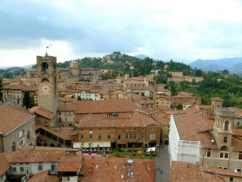 Nach einem nicht weltbewegenden Frühstück brechen wir auf gen Norden, ein Besuch von Bergamo steht noch auf dem Programm. Wieder bremst uns der dichte Verkehr etwas aus und wir erreichen später als geplant die "zweigeschoßige" Stadt. Parken in der Nähe der Standseilbahn und verlassen in einer der beiden Kabinen die moderne Unterstadt Bergamo bassa.