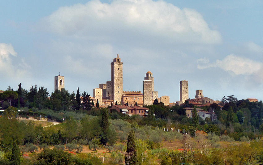 Dann fahren wir mit einem Aufzug in die Altstadt, die von noch viel mehr Touristen bevölkert wird als Volterra. Nehmen uns ein paar Stunden Zeit, um das herausgeputzte Städtchen zu besichtigen. Irgendwie passen die vollkommen eben gepflasterten Straßen aber nicht so recht zum mittelalterlichen Rest. Besuchen das Dommuseum und anschließend den mit wunderschönen Wandmalereien geschmückten Dom, wo wir vor lauter Begeisterung das Fotografierverbot glatt übersehen :-). Ein paar der Türme könnten bestiegen werden, aber angesichts des trüben Himmels verkneifen wir uns diese schweißtreibende Aktivität.