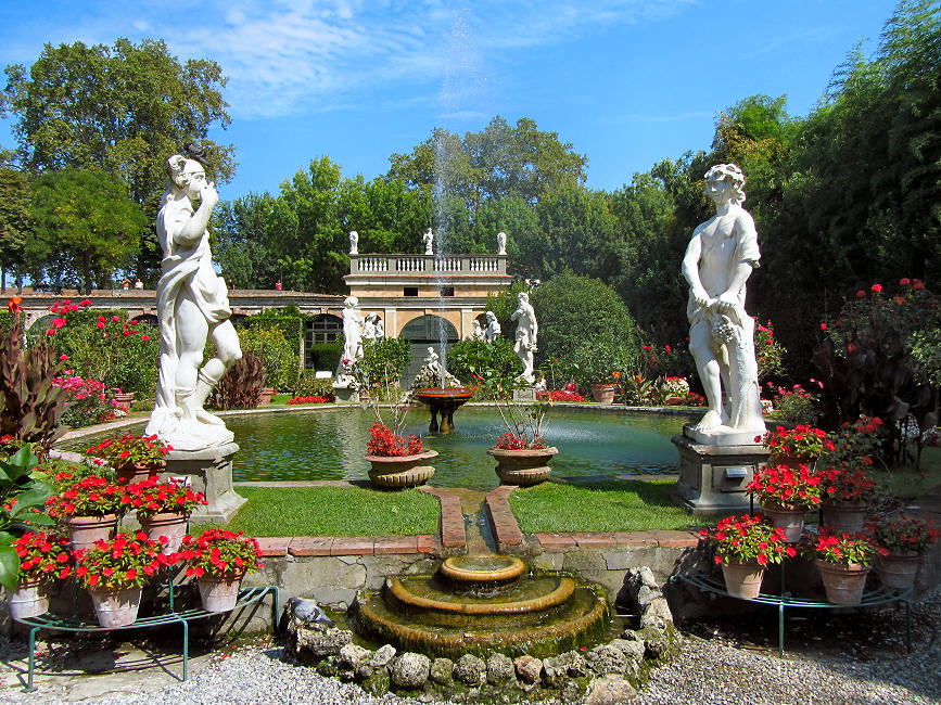 Spazieren nun - im wahrsten Sinne des Wortes planlos - durch die mittelalterlich geprägte Altstadt mit Kirchen und Türmen, Denkmälern und Palazzi und finden an einem Tor in der Stadtmauer die Touristeninfo, wo wir einen Stadtplan bekommen. So ausgestattet können wir nun zielgerichtet die besonders sehenswerten Punkte ansteuern. Beginnen beim Palazzo Pfanner, einem privaten Museum, wo neben den repräsentativen Wohnräumen einer begüterten Familie des 18. Jahrhunderts der hübsche barocke Garten mit antiken Statuen besichtigt werden kann. Der Name Pfanner ist Österreichern durchaus geläufig und geht in der Tat zurück auf einen Bierbrauer aus Hörbranz in Vorarlberg, der 1846 die erste Brauerei in Lucca etablierte und dessen Familie hier einen stadtbekannten Biergarten bis 1929 führte.