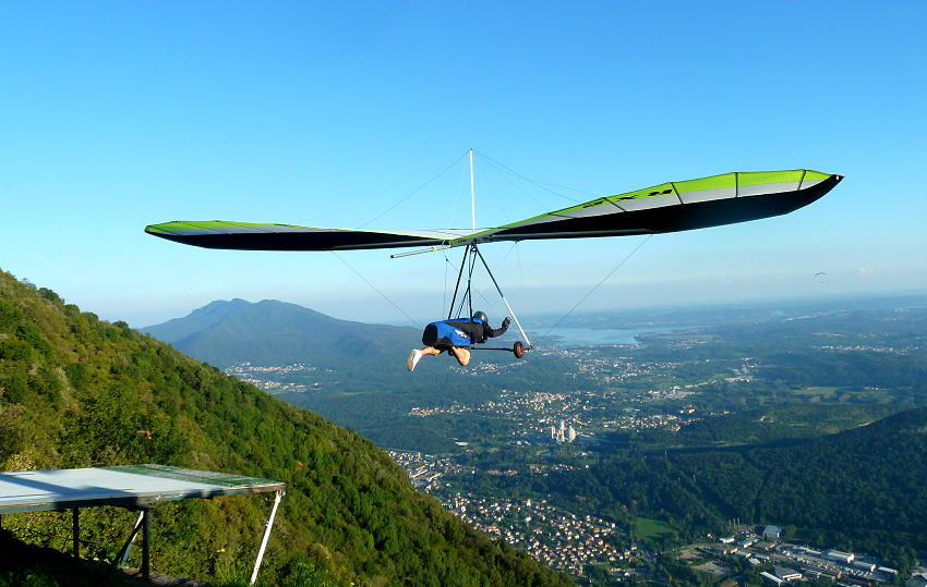 Was machen wir jetzt? An den Strand liegen? Oder ins 25 km entfernten Laveno Mombello fahren? Beschließen, noch einmal das Auto zu starten und den Aussichtsberg zu erklimmen. Dafür steht eine lustige "Kübelbahn" zur Verfügung, eine Umlaufseilbahn, die mit Stehkabinen für 2 Personen ausgestattet ist. So gelangen wir bequem in kühlere Regionen und können auf der Terrasse des Ausflugslokals entspannt den Paragleitern und Drachenfliegern bei ihrem Sport zuschauen. Auch der Blick über den See ist zu dieser Tageszeit sehr schön, und nur ungern verlassen wir gegen halb sieben dieses lauschige Plätzchen am Sasso del Ferro wieder. Unten im Tal besorgen wir in einem Supermarkt noch ein paar Lebensmittel für ein kleines Abendessen im Zimmer. Nach einem kleinen Abendspaziergang an der Seepromenade begeben wir uns dann eher zeitig zur Ruhe.