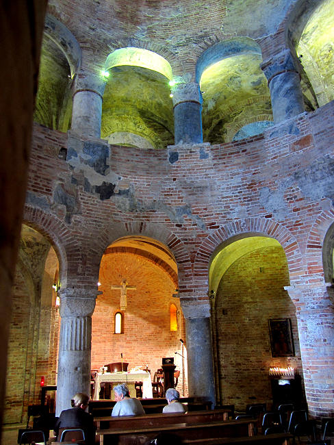 Knapp vor drei sind wir dann wieder im Zentrum und endlich gehen die Pforten des alten Doms auf. Dieser steht als gedrungener Rundbau (Rotonda) im Schatten des barocken neuen Doms und schaut von außen unscheinbar und klein aus. Aber vom Eingang aus steigt man hinunter in den runden Zentralraum des romanischen Gotteshauses. Die Schlichtheit und die Harmonie beeindrucken, da braucht es die gotischen Bischofsgräber gar nicht. Reißen uns nur ungern los, aber auch der neue Dom will noch besichtigt werden. Die barocke Pracht der Fassade verspricht mehr, als das Innere halten kann. Erwähnenswert ist höchstens das Grabdenkmal für Papst Paul VI., der aus Brescia stammte.