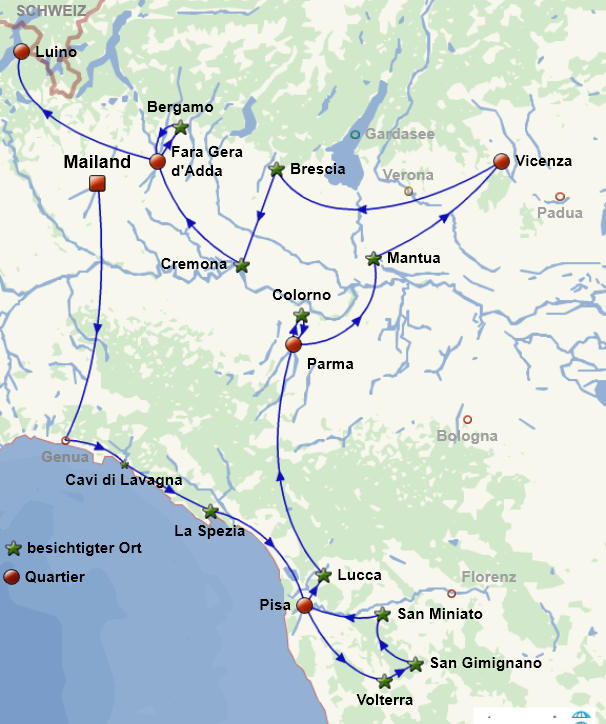 Durchforsten diverse Reiseführer und konsultieren das Internet, um die zur Verfügung stehende kurze Zeit nicht überzustrapazieren. Legen dann ein paar Ankerpunkte, von denen aus wir die Provinzen Lombardei, Toskana, Venetien und Emilia-Romagna erkunden wollen.