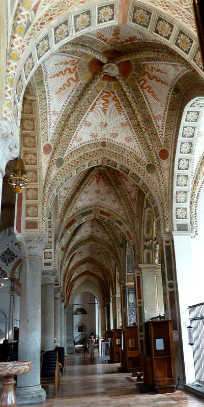 Nachdem wir nach Ablauf der Besichtigungszeit unbarmherzig hinauskomplimentiert wurden, spazieren wir noch durch den Kreuzgang des Klosters. Dort befindet sich die "Sakristei des Bramante" mit wunderbaren Wand- und Deckengemälden und zu unserem Besuchszeitpunkt eine Ausstellung mit Blättern aus dem Codex atlanticus von Leonardo da Vinci. Erstehen auch dafür ein Kombiticket, denn weitere Blätter sind in der Biblioteca Ambrosiana ausgestellt, die wir morgen besuchen wollen.