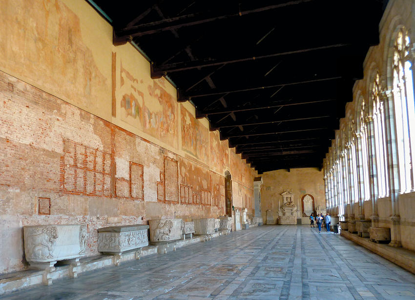 Mittlerweile ist die Sonne doch noch durchgekommen und wir kommen auf dem Weg zum Camposanto ein bisschen ins Schwitzen. Netterweise ist der Großteil dieses mittelalterlichen Friedhofs überdacht, so dass die Besichtigung der gotischen Bögen, der marmornen Grabplatten und Sarkophage und der restaurierten Fresken aus dem 14. Jahrhundert ganz angenehm verläuft.