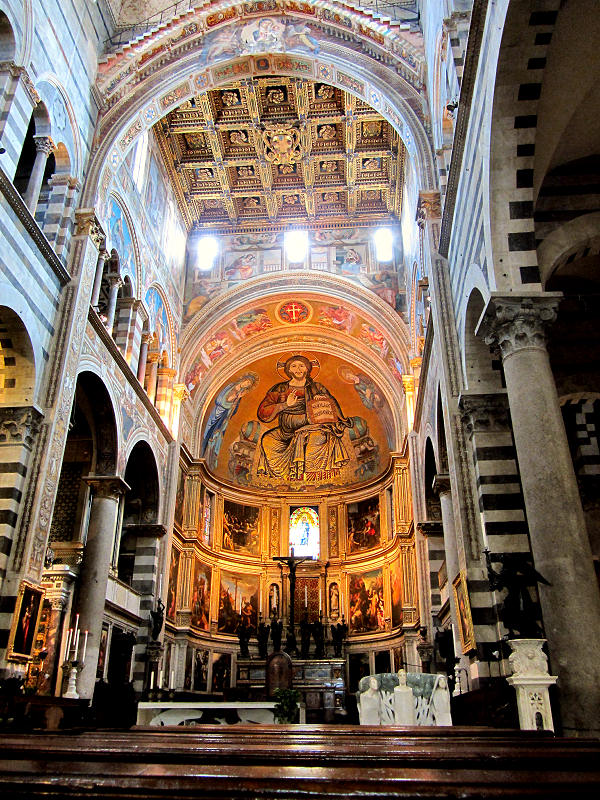 Dem heutigen Besucher bietet sich nach vielen Jahren der Renovierung und Sanierung nun wieder die Möglichkeit, den Turm zu besteigen. Da auch hier die Besucherzahl begrenzt wird, ist eine Vorabbuchung im Internet sinnvoll. So haben auch wir die Eintrittskarten für die 4 Monumente frühzeitig erworben und können uns ganz entspannt der Besichtigung widmen. Nach der Außenansicht beginnen wir im romanischen Dom mit der vergoldeten Kassettendecke und der kunstvollen Kanzel. Auch die Mosaike in den Kuppeln sind bemerkenswert.