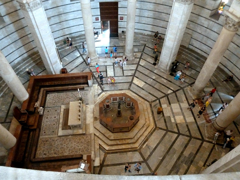 Jetzt fehlt nur noch das Baptisterium, das zwar irgendwie plump aussieht, aber doch mit der schwarz-weiß gestreiften Fassade und dem großen Taufbecken punktet. Dadurch, dass nur eine Hälfte der Kuppel mit Terrakotta-Dachplatten belegt ist, schaut das 800 Jahre alte Gebäude irgendwie unfertig aus.