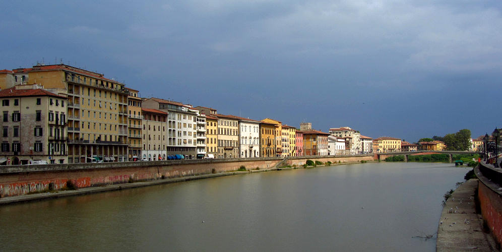 Beim Verlassen des Komplexes gegen 13:00 Uhr ist es schon wieder düster. Überlegen was wir jetzt noch machen könnten und beschließen, in die Altstadt zu gehen. Spazieren zur asymmetrischen Piazza dei Cavallieri mit dem namensgebenden bemalten Palazzo und der Universität. Dann weiter zum Arno und unter dem Vordach einer Bar schreiben wir bei einem Kaffee und leichtem Regenschauer die unterwegs erstandenen Ansichtskarten.