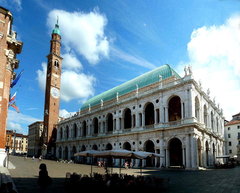 So orientiert peilen wir nun das Zentrum der Stadt an. Betreten die Altstadt durch ein Tor in der dicken Stadtmauer und finden rasch die Touristeninfo. Mit dem dort aufliegenden Stadtplan finden wir zur Piazza Mateotti, wo wir Rast machen. Über Mittag hat nur das Palladio-Museum offen, das in einem von ihm erbauten Palast zu finden ist. Recht modern aufbereitet gibt es Einblicke in einige seiner Bauten, Modelle seiner wichtigsten Werke und Erklärungen zu Baustil und -technik. Außerdem sind in diesem Gebäude derzeit erstmals "Die vier Allegorien" von Paolo Veronese gemeinsam ausgestellt.