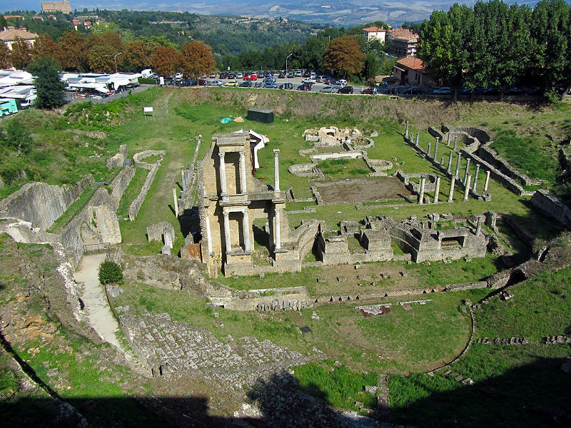 Frühstücken wieder im Freien und starten die heutige Tagestour um halb zehn. Fahren durch die hügelige Landschaft der Toskana nach Volterra und finden kurz vor zehn im Parkhaus 1 direkt unter der Altstadt noch reichlich Parkplätze vor.