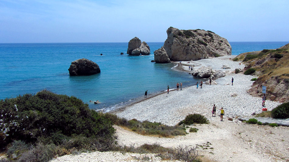 7 km ostwärts liegt in einer malerischen, hübschen Bucht der Aphrodite-Felsen Petra tou Romion. Hier soll die Göttin Aphrodite dem Meer entstiegen sein um Zypern zu ihrer Heimat zu machen, was aber wohl eher unwahrscheinlich ist ;-). Der Zugang vom Parkplatz führt an einem Kiosk vorbei und durch einen Tunnel unter der Straße durch. Ist viel sicherer als die Kletterei über die Leitschienen.