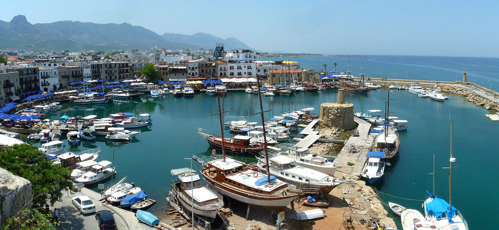 Für heute haben wir einen Ausflug an die Nordküste der Insel geplant. Mitten in der Altstadt von Nikosia verläuft die stark befestigte Grenze zwischen der Republik Zypern und der nur von der Türkei anerkannten Türkischen Republik Nordzypern. Einen Grenzübergang gibt es: Fußgänger dürfen in der Ledra-Straße zwischen Süd und Nord wechseln. Auch diesmal genügt der Personalausweis und hinter der Grenze hebt Werner am Bankomaten 300,- Türkische Lira ab. Dann spazieren wir weiter nordwärts zum Busplatz beim Girne-Tor am Rand der ummauerten Altstadt.