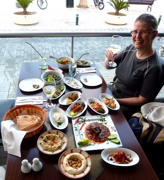Kurz nach sieben machen wir uns auf die Suche nach einem Abendessen. Oft treffen wir dabei auf Speisekarten in kyrillischer Schrift, offenbar machen wirklich sehr viele Russen hier Urlaub. Wir nehmen ein zypriotisches Lokal mit einer Mezze-Platte für zwei, ist dann reichlich und gut.