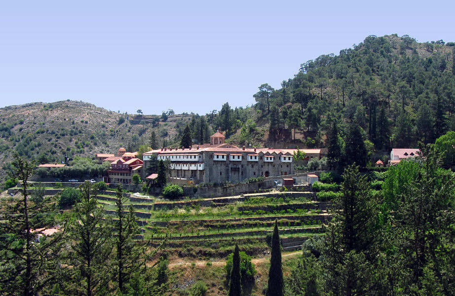 , beim Frauenkloster Agios Heraklidios vorbei, wo gerade die Vorbereitungen für ein Fest laufen und wir nicht lange verweilen. Kurven über abenteuerliche Serpentinen immer weiter aufwärts und kommen glücklich beim Machairas-Kloster an. Dieses ist an einen Hang gebaut und liegt im Duft unzähliger blühender Holunderbüsche. Die Besichtigung ist für Touristengruppen auf den Vormittag beschränkt, "Einzelpilger" haben immer Zutritt.