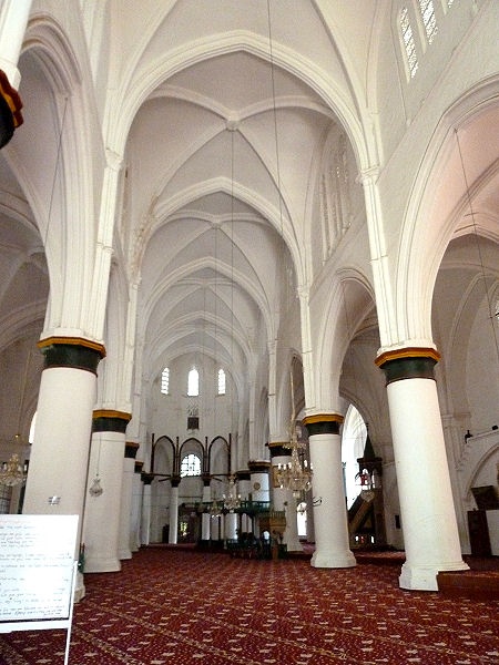 Hier erkunden wir nun den türkischen Teil der Altstadt. Viel ist nicht (mehr) zu sehen und auch das Volkskunde-Museum im Derwish-Pasha-Haus ist derzeit eine Baustelle. Spazieren einfach so durch die Gassen, stöbern durch den kleinen gedeckten Basar und schauen die Selimiye-Moschee in der einstigen gotische Basilika Agia Sophia an. Die Gebetsnische ist recht schief (nach Mekka ausgerichtet) in einem Seitenschiff untergebracht und auch die Gebetsteppiche sind quer in der weiß bemalten Säulenhalle verlegt. Trotzdem ist sie recht hübsch.