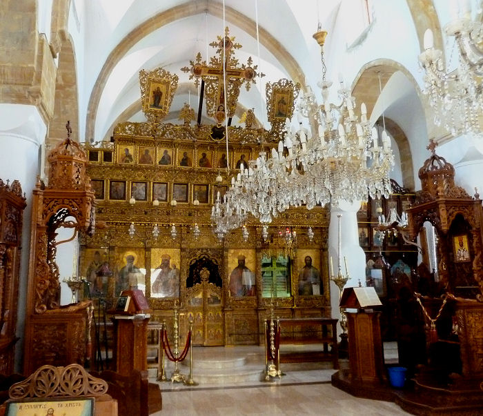 Es ist nun Mittag und brütend heiß. Wir halten in einem klimatisierten Lokal Mittagsrast, dann gehen wir weiter zum erzbischöflichen Palast. Dort ist ein weitläufiges Ikonen- und Kunstmuseum, das mehr Zeit erfordert, als ursprünglich gedacht - viele Ikonen ohne echte Highlights und es dehnt sich auch auf diverse Nebenflügel aus. Etwas geschafft schauen wir noch die auf dem Gelände gelegene, prächtig geschmückte Agios Joannis-Kirche an.