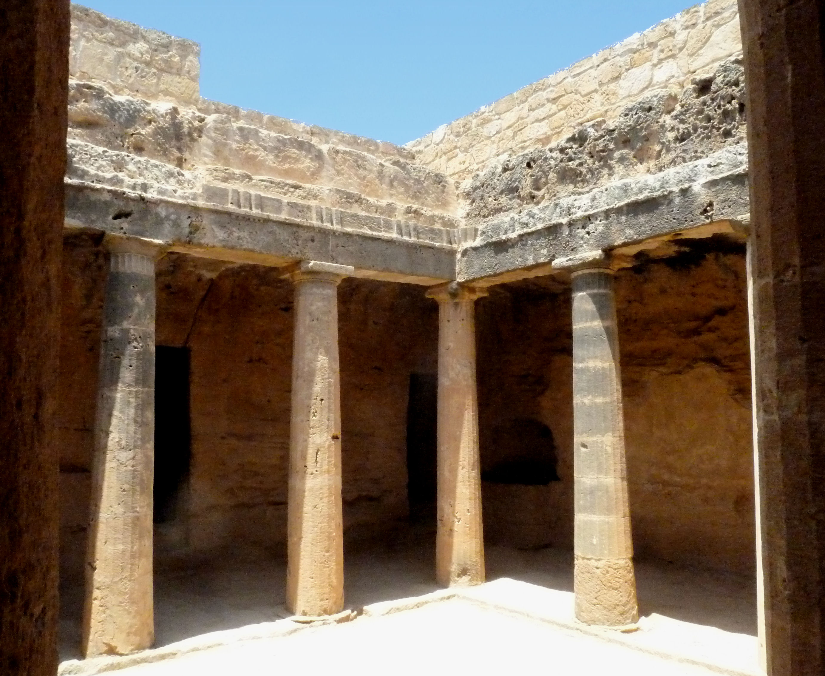 Fahren als nächstes zur Grotte der heiligen Solomoni (na ja) und weiter zu den Königsgräbern von Nea Paphos aus ptolemäischer Zeit. In der ärgsten Mittagshitze erkunden wir die Gräber wohlhabender Familien der Oberschicht. Die Gräber sind als mehr oder weniger prächtig geschmückte Höhlen in den Sandstein gegraben. Einige sind nur einfach Löcher im Boden, andere säulenumstellte Atrien. Sehr beeindruckend, aber auch sehr ausgedehnt. Die zarte Brise vom Meer her ist auch nicht wirklich kühlend.