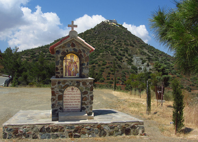 Nach einer kurzen Mittagsrast in einem kleinen Café kurven wir weiter, hügelan zum Kloster Stavrovouni, das auf einem Fels über einem steilen Abhang liegt. Dieses streng-orthodoxe Kloster ist reine Männersache, Frauen ist der Zutritt verwehrt, auch fotografieren ist nicht gestatten. Werner schaut es sich natürlich von innen an, die vielen Ikonen sehen ihm aber viel zu neu und kitschig-bunt aus. Die etwas tiefer gelegene Allerheiligen-Kirche steht allen Besuchern offen, aber auch hier fehlt ein bisschen der antike Glanz.