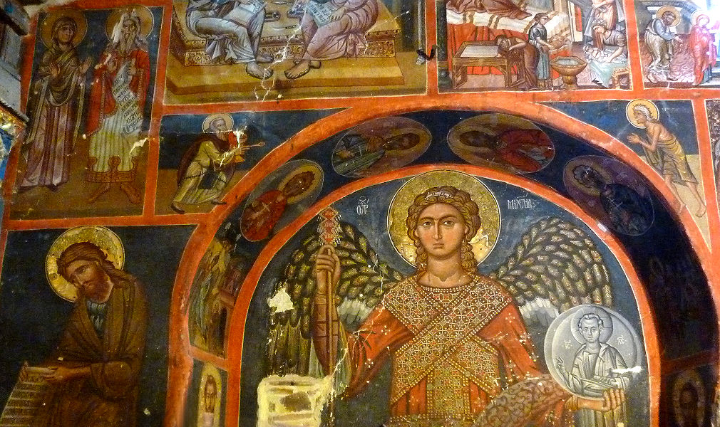 Unser Navi führt uns auch problemlos zur Timios Stavros tou Agiasmati-Kirche in der Nähe von Platanistasa, die ist allerdings verschlossen. Ein Zettel an der Tür nennt eine Telefonnummer, unter der wir gebeten werden, den Schlüssel im Kafenion (dem einziges Café im Dorf) zu holen. Kurven die 7 km dorthin, aber kein Schlüssel. Unsere Hartnäckigkeit zeigt aber Wirkung und bald taucht ein kleines Männlein auf, das einen gewaltigen Schlüsselbund dabei hat und mit uns zurück zur Scheunendachkirche fährt. Er schaltet den Generator ein, schließt auf und erklärt uns in holprigem Englisch jedes einzelne Wandbild. Werner darf auch hinter die Ikonostase blicken, Claudia muss an der Schwelle warten. Das kleine Kirchlein ist innen und außen vollkommen bemalt, die Fresken sind auch noch sehr gut erhalten. Unsere Empfehlung: Zeit mitbringen und unbedingt anschauen!