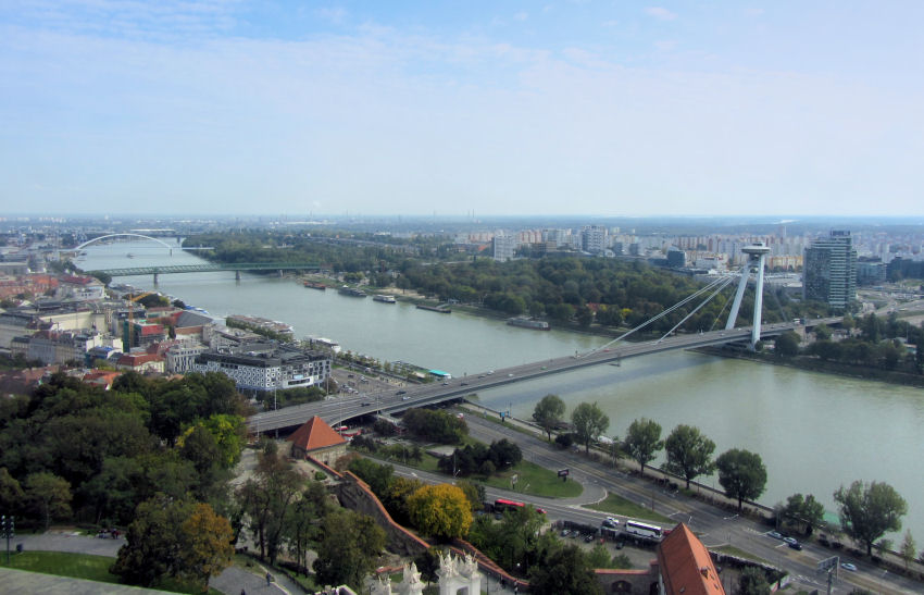 Umrunden soweit es geht den Dom und steigen dann den Burgberg hinauf. Vor dem Eingang zur viertürmigen weiß getünchten Burg steht ein modernes Reiterdenkmal für den ersten Slawenfürsten Svatopluk, innen befindet sich das Nationalmuseum, das wir nun besuchen. Die Ausstellung wirkt etwas zusammengewürfelt: Kelten im Untergeschoss, Ansichten von Preßburg und eine temporäre Glasausstellung im 1. Stock. Dann alte Reklameschilder und ein historisches Museum mit einer 23000 Jahre alten Mutterfigur aus Elfenbein. Schließlich der Aufstieg in den 47 m hohen Kronenturm mit einem netten Rundblick über die Altstadt, die Donau und die Brücke mit dem Ufo-Restaurant am Mittelpfeiler. Beim Abstieg kommt man dann noch an einer Kopie der ungarischen Stephanskrone vorbei und irgendwann ist man wieder im Freien.