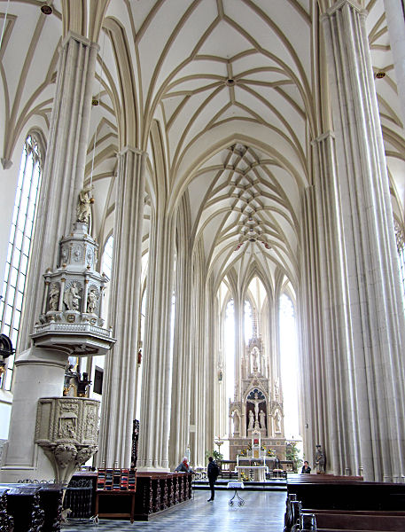 Weiter geht es dann zum aufgelassenen Minoritenkloster (nun ein Museum) und hinauf zur Burg auf einer Erhebung über dem Fluss Thaya. Dort steht mit der Rotunde St. Katharina eines der ältesten noch erhaltenen Gebäude der Stadt - innen angeblich reich mit romanischen Fresken geschmückt, bei unserem Besuch aber leider geschlossen. Von hier heroben hat man einen hübschen Blick auf das Zentrum und zur St. Nikolaus-Kirche, dem Dom von Znaim. Dorthin gehen wir als nächstes und das lohnt sich - zumindest heute. Das Innere ist derzeit mit üppigen Arrangements von Obst, Gemüse und Feldfrüchten zum Erntedank geschmückt.