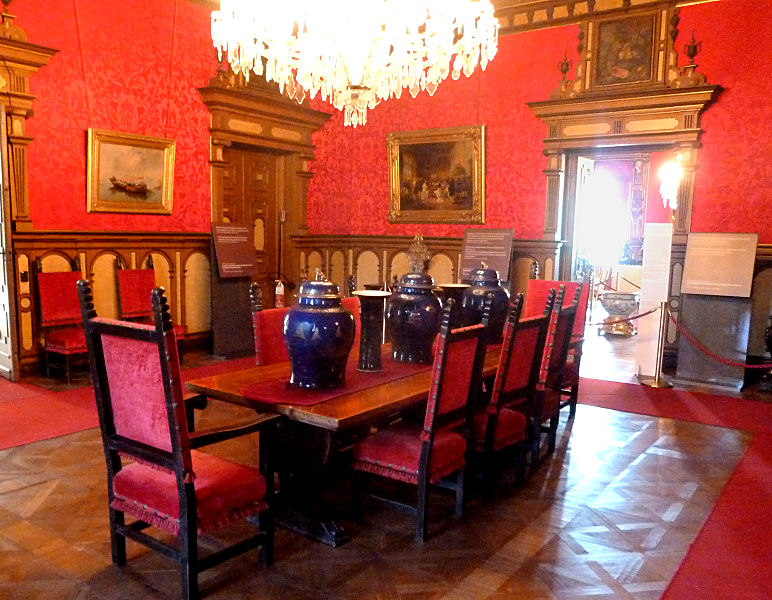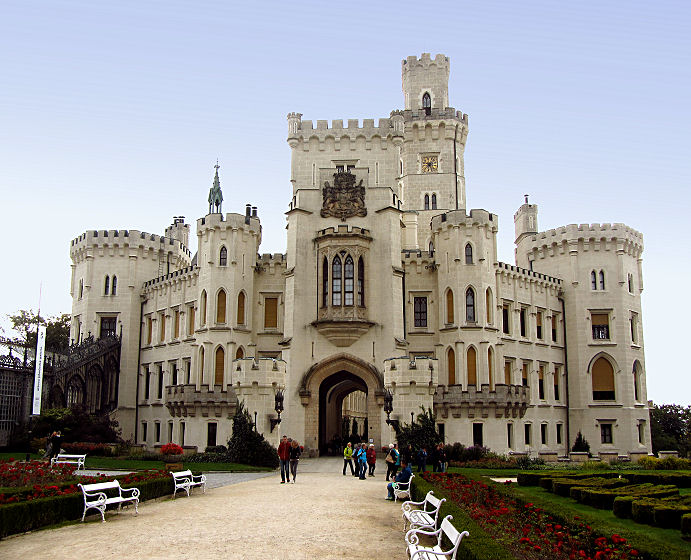 Fahren etwa 10 km nach Norden, dort liegt in Hluboká nad Vltavou das namengebende Schloss Frauenberg auf einem Hügel. Kommen kurz nach 10:00 Uhr dort an und haben Glück, wir können uns einer tschechischen Führung anschließen. Ohne Führung ist eine Innenbesichtigung nicht möglich, aber netterweise bekommen wir einen deutschen Text ausgehändigt, so kommen wir in den Genuss der vielen Portraits diverser Vorbesitzer und dunkler holzgetäfelter Räume. Der Park drumherum ist mit akkurat gestutzten Buchsbaumhecken bepflanzt und man kann moderne Kunstwerke bestaunen. Alles in allem ist das Gebäude im Tudorstil wirklich ganz nett, das sich die Fürsten zu Schwarzenberg da in die Gegend gestellt haben.