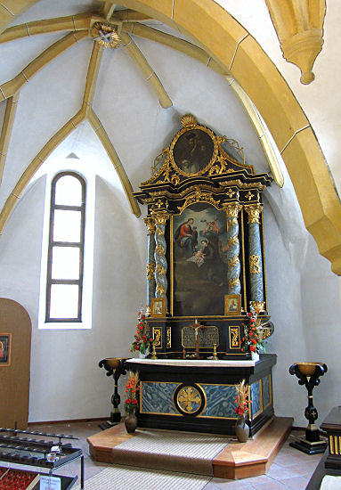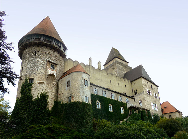 Anschließend fahren wir ein halbes Stündchen nach Rappottenstein. Hier inmitten von Hügeln und Wäldern thront auf einem Granitfels die Burg Rappottenstein. Auch hier ist eine Führung nötig, um mehr als den Aufgang zu diesem mittelalterlichen Wehrbau zu sehen. Die nächste beginnt um 14:00 Uhr und eine kleine Gruppe folgt dem gut informierten Herrn durch mehrere Vorhöfe, Innenhöfe und Torbögen. Beeindruckend ist der dreigeschossige Arkadenhof, aber auch die Wandmalereien aus der Renaissance im Inneren und der kleine gotische Altar in der Burgkapelle sind sehenswert. Auch hier sind wir wieder circa eine Stunde beschäftigt.
