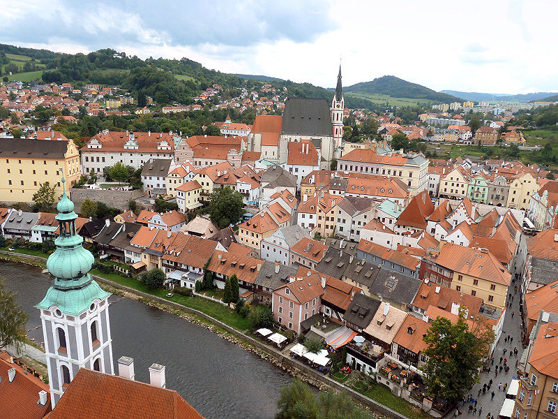 So fahren wir knapp 20 km Umweg zu einer Brücke und kommen am Nordufer wieder zurück. Dann geht es zügig durch sanft hügelige Landschaft bis wir zu Mittag Český Krumlov, zu deutsch Krumau, erreichen. Stellen das Auto nahe der Innenstadt auf einem Parkplatz beim Schloss ab und gehen gleich hinauf zum Eingang. Die nächste Führung ginge erst in 2 Stunden los, aber so lange wollen wir nicht tatenlos warten.