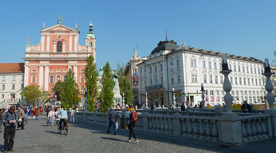 Bei Sonnenschein spazieren wir dann zum barocken Dom St. Nikolaus mit schönem Deckenfresko. Danach geht es durch den ausgedehnten, zwischen Dom und Fluss gelegenen Markt mit Verpflegungsständen, Obst und Gemüse, Textilien und Souvenirs zur Drachenbrücke. Dieses Jugendstilbauwerk wird von vier geflügelten grünen Drachen, dem Wappentier der Stadt, geschmückt und wurde anlässlich des 40. Thronjubiläums von Kaiser Franz Josef geplant. Auf der nördlichen Seite des Flusses gehen wir zur Franziskanerkirche bei den Drei Brücken zurück. Hier finden sich auch einige Jugendstilgebäude, die unter anderem das älteste Kaufhaus Laibachs und ein Literatencafé beherbergen.