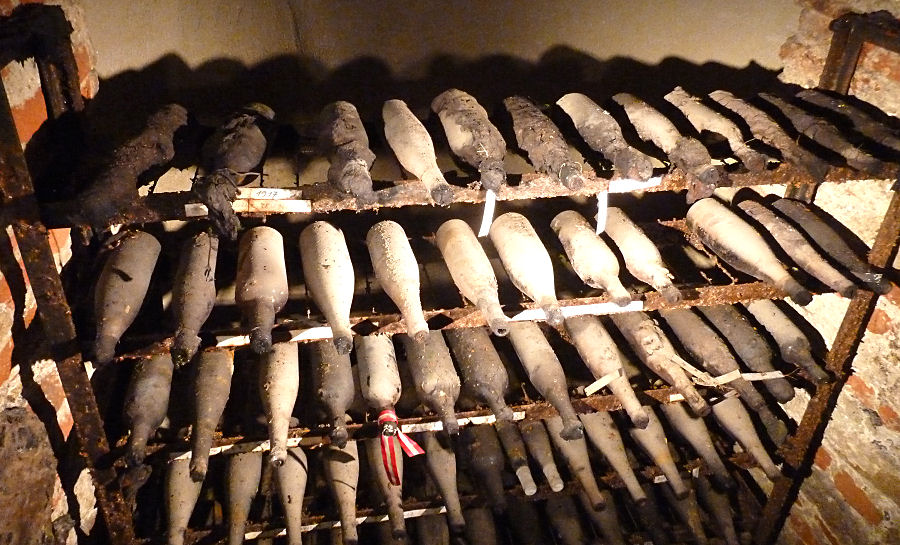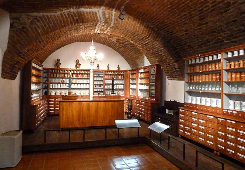 Zuerst spazieren wir an der backsteinroten Basilika der Mutter der Barmherzigkeit vorbei und gönnen uns dann am Grajsky trg vor dem Stadtschloss in der Sonne eine Erfrischung. Danach besuchen wir das im Inneren gelegene Regionalmuseum mit einer kunterbunten Sammlung von allem Möglichen: mittelalterliche Waffen und eine Apotheke aus alter Zeit, Musikinstrumente und Zinnfiguren, Sakrales und noch einiges mehr. Nach über einer Stunde verlassen wir das Schloss und folgen den Schildern zu einem gleich nebenan gelegenen Weinkeller. In ein paar Minuten beginnt eine Führung, wir dürfen aber unbegleitet in die nicht mehr genutzten Gewölbe gehen und statt des Eintritts verkosten wir anschließend zwei Weine.