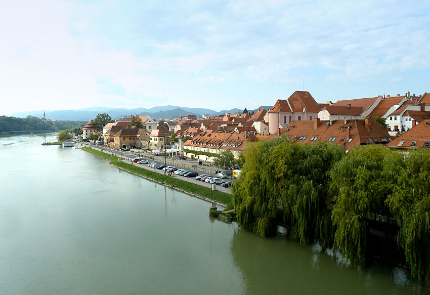 Da die Sonne sich doch noch unser erbarmt, spazieren wir zur Drau und auf die Brücke mit Blick auf zwei noch erhaltene Bastionstürme der mittelalterlichen Stadtbefestigung. Dann gehen wir hinunter zur Uferpromenade im Stadtteil Lent und sehen uns dort noch die älteste veredelte Weinrebe der Welt (rund 400 Jahre alt) an. Das Haus der alten Rebe beherbergt ein Weinmuseum, auf das wir aber heute keine Lust mehr haben. Daher spazieren wir bald durch die Altstadt zurück zum Parkhaus.