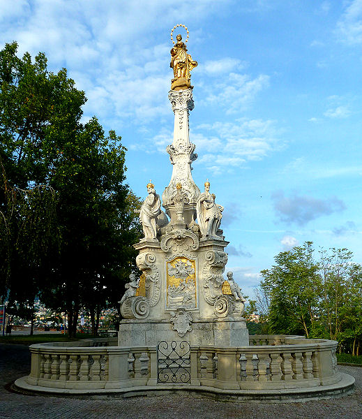 Diesem folgend kommen wir zuerst zum (hässlich) modernen Nationaltheater und dann zum zentralen Szechenyi-Platz. Dieser beeindruckt neben den hübschen Barockfassaden der umstehenden Häuser mit der Mariensäule und der Benediktinerkirche mit den zwei Türmen. Das barocke Innere ist reich geschmückt, die goldene Kanzel sticht besonders hervor. Der Spaziergang führt uns weiter durch die Altstadt mit modernen Skulpturen zur Karmeliterkirche. Auch diese ist barock mit einem ovalen Kirchenschiff. Nur wenige Minuten Fußmarsch entfernt steht der Dom, allerdings wegen Renovierung geschlossen, daher gehen wir weiter zum Bischofspalast, aber auch der ist wegen Renovierung geschlossen. Immerhin kann man einen Turm besteigen, was wir dann auch machen. Nach einem Abstecher zu einem Museum mit moderner Kunst und dem "Siphon-Brunnen" holen wir das Auto aus der Parkgarage und fahren eine knappe halbe Stunde südwärts.