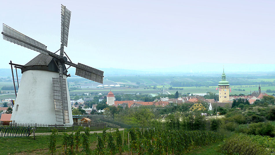 Zurück an der Oberfläche hat sich die Sonne wieder verzogen, dafür sperren die Verpflegstände jetzt langsam auf. Erstehen Eintrittskarten für das Festgelände und kosten uns durch Sturm in allen Farben. Danach verlassen wir den Ort, um uns in der Umgebung umzusehen. Die Retzer Windmühle in den Weinbergen oberhalb der Stadt bietet einen netten Blick in die Kulturlandschaft, hinüber auf den Kalvarienberg und auf das geschmückte Rathaus.
