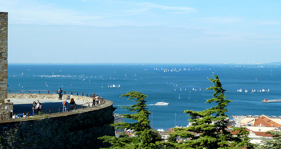 Vorbei an den römischen Säulenresten vor der Kirche gehen wir dann hinüber zum Castello di San Giusto, das heute ein Schloss- und Waffenmuseum beherbergt, sowie eine eigene Sammlung für römische Funde aus Triest und der Umgebung. Im Innenhof sind auch zwei Figuren ausgestellt, die in früheren Jahren die Glocke der Rathausuhr geschlagen haben. Von der Burgmauer hat man einen ungehinderten Blick über die Stadt, den Hafen und die Bucht von Triest bis zum Schloss Miramare.