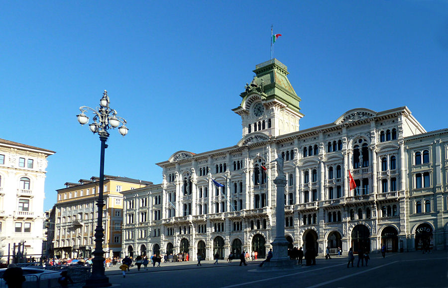 Verlassen gegen 13:00 Uhr diese geschichtsträchtige Stätte und begeben uns hinunter in das Triest der Gründerzeit. Am Hauptplatz, der Piazza dell’Unità d’Italia, bewundern wir die neoklassizistischen Prachtbauten wie den Regierungspalast oder das Rathaus.