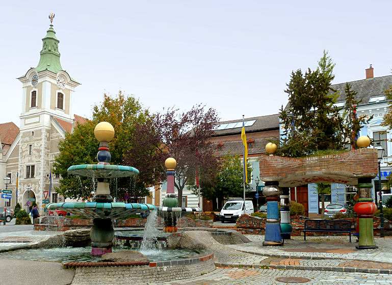 Der Himmel hängt schon wieder tief - hier in einer der kältesten Regionen Österreichs macht das nicht wirklich Spaß! Tapfer fahren wir eine dreiviertel Stunde durch Felder und Wiesen südwärts und sind um halb zehn in Zwettl. Der Hauptplatz mit den bunten Häusern, das alte Rathaus und der Hundertwasserbrunnen wären mit etwas Sonne bestimmt ganz hübsch, so aber stellen wir den Kragen auf und verlassen das Städtchen mit dem Ziel Zisterzienserstift Zwettl.